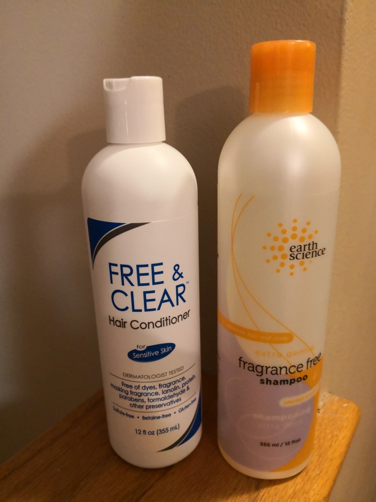I have tried a few different fragrance free hair products and these two are the best ones for my hair. There are hair products that go with both of them (Earth Science Fragrance Free conditioner and Vanicream shampoo) but they don’t work well for me. I would recommend trying the shampoo and conditioner sets for yourself, though. My hair is pretty finicky and high maintenance!